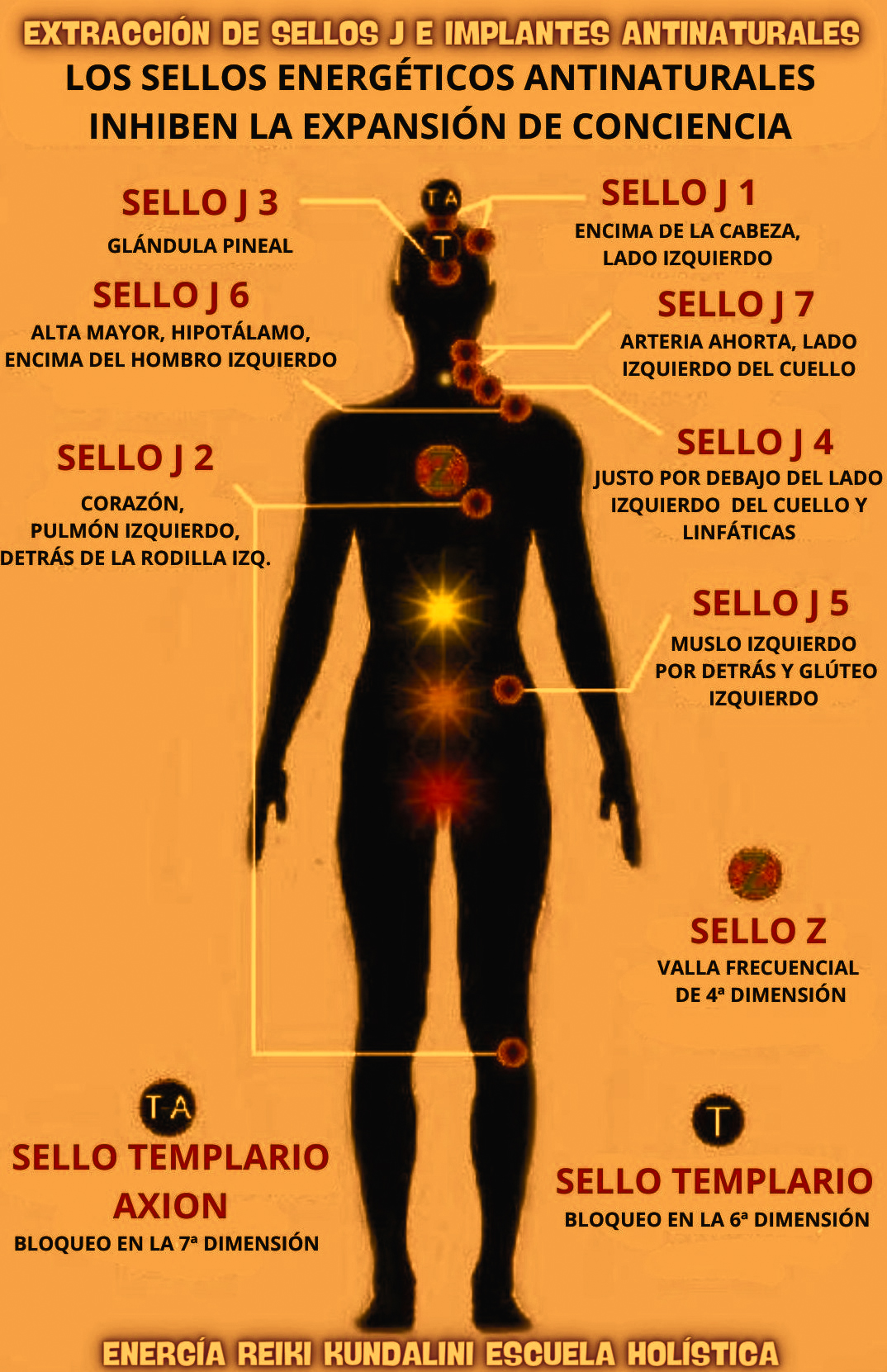 Los Sellos-J Están situados en el lado izquierdo del cuerpo y pueden manifestar dolor y enfermedades en sus respectivas localizaciones. La extracción de los sellos-J se realiza en una sesión a distancia, durante la cual quedan eliminados de tu energía los 7 sellos-J y todos los demás Implantes Antinaturales que te relataré durante esta información.